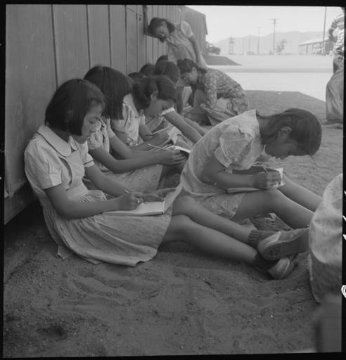 | Keywords: Manzanar Relocation Center, Manzanar, California. An elementary school with voluntary attendance ha . . . - NARA - 537961.jpg Scope and content The full caption for this photograph reads Manzanar Relocation Center Manzanar California An elementary school with voluntary attendance has been established with volunteer evacuee teachers most of whom are college graduates No school equipment is as yet obtainable and available tables and benches are used However classes are often held in the shade of the barrack building General notes 537961 Local identifier 210-G-C664 Department of the Interior War Relocation Authority 02/16/1944 - 06/30/1946 NARA-Author Lange Dorothea 1895-1965 Photographer 1372774 <br /> Still Picture Records Section Special Media Archives Services Division NWCS-S National Archives at College Park 8601 Adelphi Road College Park MD 20740-6001 1942-07-01 Record group Record Group 210 Records of the War Relocation Authority 1941 - 1989 Record group ARC 537 Central Photographic File of the War Relocation Authority compiled 1942 - 1945 Series ARC 536000 File unit File unit ARC Variant control numbers NAIL Control Number NWDNS-210-G-C664 Other versions <gallery> File Manzanar_Relocation_Center _Manzanar _California _An_elementary_school_with_voluntary_attendance_ha_ _ _ _-_NARA_-_537961 tif tif File Manzanar_Relocation_Center _Manzanar _California _An_elementary_school_with_voluntary_attendance_ha_ _ _ _-_NARA_-_537961 jpg jpg </gallery> NARA-cooperation PD-USGov Photographs by Dorothea Lange of Manzanar War Relocation Center |