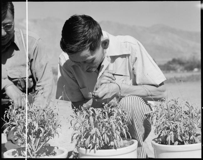 | Keywords: Manzanar Relocation Center, Manzanar, California. George J. Yokomizo, hybridizer for the guayule ru . . . - NARA - 538030.jpg Scope and content The full caption for this photograph reads Manzanar Relocation Center Manzanar California George J Yokomizo hybridizer for the guayule rubber experiment project General notes 538030 Local identifier 210-G-C736 Department of the Interior War Relocation Authority 02/16/1944 - 06/30/1946 NARA-Author Lange Dorothea 1895-1965 Photographer 1372774 <br /> Still Picture Records Section Special Media Archives Services Division NWCS-S National Archives at College Park 8601 Adelphi Road College Park MD 20740-6001 1942-06-29 Record group Record Group 210 Records of the War Relocation Authority 1941 - 1989 Record group ARC 537 Central Photographic File of the War Relocation Authority compiled 1942 - 1945 Series ARC 536000 File unit File unit ARC Variant control numbers NAIL Control Number NWDNS-210-G-C736 Other versions <gallery> File Manzanar_Relocation_Center _Manzanar _California _George_J _Yokomizo _hybridizer_for_the_guayule_ru_ _ _ _-_NARA_-_538030 tif tif File Manzanar_Relocation_Center _Manzanar _California _George_J _Yokomizo _hybridizer_for_the_guayule_ru_ _ _ _-_NARA_-_538030 jpg jpg </gallery> NARA-cooperation PD-USGov Photographs by Dorothea Lange of Manzanar War Relocation Center |