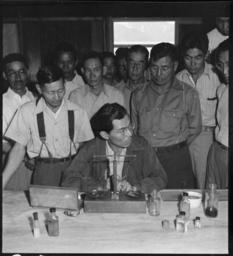 | Keywords: Manzanar Relocation Center, Manzanar, California. Chemists, nurserymen, and plant propagators at th . . . - NARA - 538035.jpg Scope and content The full caption for this photograph reads Manzanar Relocation Center Manzanar California Chemists nurserymen and plant propagators at this War Relocation Authority center assemble to witness a new experiment in an attempt to resolve the amount of rubber produced in a small quantity of the guayule plant Frank Hirosawa research rubber chemist is seated General notes 538035 Local identifier 210-G-C741 Department of the Interior War Relocation Authority 02/16/1944 - 06/30/1946 NARA-Author Lange Dorothea 1895-1965 Photographer 1372774 <br /> Still Picture Records Section Special Media Archives Services Division NWCS-S National Archives at College Park 8601 Adelphi Road College Park MD 20740-6001 1942-06-28 Record group Record Group 210 Records of the War Relocation Authority 1941 - 1989 Record group ARC 537 Central Photographic File of the War Relocation Authority compiled 1942 - 1945 Series ARC 536000 File unit File unit ARC Variant control numbers NAIL Control Number NWDNS-210-G-C741 Other versions <gallery> File Manzanar_Relocation_Center _Manzanar _California _Chemists _nurserymen _and_plant_propagators_at_th_ _ _ _-_NARA_-_538035 tif tif File Manzanar_Relocation_Center _Manzanar _California _Chemists _nurserymen _and_plant_propagators_at_th_ _ _ _-_NARA_-_538035 jpg jpg </gallery> NARA-cooperation PD-USGov Photographs by Dorothea Lange of Manzanar War Relocation Center |