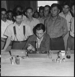 | Keywords: Manzanar Relocation Center, Manzanar, California. Chemists, nurserymen, and plant propagators at th . . . - NARA - 538037.jpg Scope and content The full caption for this photograph reads Manzanar Relocation Center Manzanar California Chemists nurserymen and plant propagators at this War Relocation Authority center assemble to witness a new experiment in an attempt to resolve the amount of rubber produced in a small quantity of the guayule plant Frank Hirosawa research rubber chemist is seated in the foreground General notes 538037 Local identifier 210-G-C743 Department of the Interior War Relocation Authority 02/16/1944 - 06/30/1946 NARA-Author Lange Dorothea 1895-1965 Photographer 1372774 <br /> Still Picture Records Section Special Media Archives Services Division NWCS-S National Archives at College Park 8601 Adelphi Road College Park MD 20740-6001 1942-06-28 Record group Record Group 210 Records of the War Relocation Authority 1941 - 1989 Record group ARC 537 Central Photographic File of the War Relocation Authority compiled 1942 - 1945 Series ARC 536000 File unit File unit ARC Variant control numbers NAIL Control Number NWDNS-210-G-C743 Other versions <gallery> File Manzanar_Relocation_Center _Manzanar _California _Chemists _nurserymen _and_plant_propagators_at_th_ _ _ _-_NARA_-_538037 tif tif File Manzanar_Relocation_Center _Manzanar _California _Chemists _nurserymen _and_plant_propagators_at_th_ _ _ _-_NARA_-_538037 jpg jpg </gallery> NARA-cooperation PD-USGov Photographs by Dorothea Lange of Manzanar War Relocation Center |