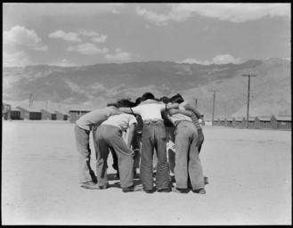 | Keywords: Manzanar Relocation Center, Manzanar, California. Baseball players in a huddle. This game is very . . . - NARA - 538066.jpg Scope and content The full caption for this photograph reads Manzanar Relocation Center Manzanar California Baseball players in a huddle This game is very popular with 80 teams having been formed to date Most of the playing is done in the wide firebreak between blocks of barracks General notes 538066 Local identifier 210-G-C773 Department of the Interior War Relocation Authority 02/16/1944 - 06/30/1946 NARA-Author Lange Dorothea 1895-1965 Photographer 1372774 <br /> Still Picture Records Section Special Media Archives Services Division NWCS-S National Archives at College Park 8601 Adelphi Road College Park MD 20740-6001 1942-07-02 Record group Record Group 210 Records of the War Relocation Authority 1941 - 1989 Record group ARC 537 Central Photographic File of the War Relocation Authority compiled 1942 - 1945 Series ARC 536000 File unit File unit ARC Variant control numbers NAIL Control Number NWDNS-210-G-C773 Other versions <gallery> File Manzanar_Relocation_Center _Manzanar _California _Baseball_players_in_a_huddle _This_game_is_very_ _ _ _-_NARA_-_538066 tif tif File Manzanar_Relocation_Center _Manzanar _California _Baseball_players_in_a_huddle _This_game_is_very_ _ _ _-_NARA_-_538066 jpg jpg </gallery> NARA-cooperation PD-USGov Photographs by Dorothea Lange of Manzanar War Relocation Center |