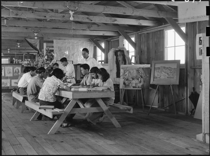 | Keywords: Manzanar Relocation Center, Manzanar, California. Class is being held in the Art School at this War . . . - NARA - 538179.jpg Scope and content The full caption for this photograph reads Manzanar Relocation Center Manzanar California Class is being held in the Art School at this War Relocation Authority center for evacuees of Japanese ancestry Instruction is given in oil and water-color life-drawing and sketching lettering poster-making and fashion drawing General notes 538179 Local identifier 210-G-C897 Department of the Interior War Relocation Authority 02/16/1944 - 06/30/1946 NARA-Author Lange Dorothea 1895-1965 Photographer 1372774 <br /> Still Picture Records Section Special Media Archives Services Division NWCS-S National Archives at College Park 8601 Adelphi Road College Park MD 20740-6001 1942-06-30 Record group Record Group 210 Records of the War Relocation Authority 1941 - 1989 Record group ARC 537 Central Photographic File of the War Relocation Authority compiled 1942 - 1945 Series ARC 536000 File unit File unit ARC Variant control numbers NAIL Control Number NWDNS-210-G-C897 Other versions <gallery> File Manzanar_Relocation_Center _Manzanar _California _Class_is_being_held_in_the_Art_School_at_this_War_ _ _ _-_NARA_-_538179 tif tif File Manzanar_Relocation_Center _Manzanar _California _Class_is_being_held_in_the_Art_School_at_this_War_ _ _ _-_NARA_-_538179 jpg jpg </gallery> NARA-cooperation PD-USGov Photographs by Dorothea Lange of Manzanar War Relocation Center |