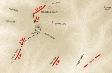 | Keywords: Map of 400 Plateau Anzac landing.jpg The situation of the Australian 1st Division on 400 Plateau on the first April 25 and second April 26 day of the landing at Anzac Cove Units are shown in red The position reached by Lieutenant Loutit's party on the third ridge early on the first day is indicated Following his retreat after 9 30am the survivors took up position overlooking Wire Gully shown in pale red The approximate position taken up by about half of the 9th Battalion under Major Salisbury at the head of Owen's Gully is shown When at about 9am this strong line was abandoned a large gap developed across the centre of the plateau The position of Major Bennett's contingent from the 6th Battalion on Pine Ridge is indicated This group was annihilated on the evening of the first day The 4th Battalion took up position to the left of the 8th Battalion on Bolton's Ridge in the evening of the first day On the second day General Bridges instructed small parties on the plateau to form a line along the edges of the Daisy Patch ; a flat scrub-free region covered with flowers The 4th Battalion mistakenly advanced as well following the path shown by the dotted red line The approximate front line that developed across the plateau after the second day is shown as a dashed black line The dog-leg to avoid the Daisy Patch resulted in a narrow salient known as The Pimple Derived from Map No 20 in Ch 21 Vol I The Story of Anzac of the en Official History of Australia in the War of 1914-18 by en C E W Bean en wikipedia 2004-04-18 Gsl wikipedia en Gsl original upload log page en wikipedia Map_of_400_Plateau_Anzac_landing jpg 2004-04-19 11 02 Gsl 800×524×8 67826 bytes <nowiki>show 9th bn position</nowiki> 2004-04-18 06 57 Gsl 800×524×8 67542 bytes <nowiki></nowiki> Maps of the Battle of Gallipoli |