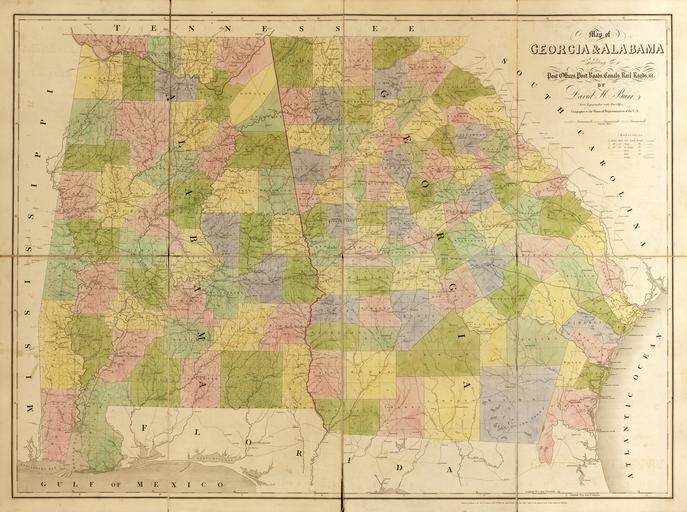 | Keywords: Map of Georgia and Alabama WDL9597.png Artwork ru Бу Дэвид Г 1803-1875 гг fr Burr David H 1803-1875 en Burr David H 1803-1875 zh 大卫·伯尔,1803-1875 年 pt Burr David H 1803-1875 ar ديفيد بور، 1803-1875 es Burr David H 1803-1875 ru Ка та штатов Джо джия и Алабама fr Carte de la Géorgie et de l'Alabama en Map of Georgia and Alabama zh 佐治亚州和阿拉巴马州 图 pt Mapa da Geórgia e do Alabama ar خريطة جورجيا وألاباما ru Дэвид Г Бу 1803 1875 гг землеме и ка тог аф служил топог афом Почтового депа тамента США в 1832 1838 гг и геог афом Палаты п едставителей в 1838 1847 гг Под уководством гене ального почтмейсте а Бу соби ал от почтмейсте ов всей ст аны инфо мацию о т анспо тных ма ш утах почтовых т актах железных до огах и каналах а также о асположении почтовых отделений с целью выпуска большого комплекта госуда ственных и егиональных ка т Опубликованный в 1839 г известной лондонской ка тог афической фи мой Джона Э оусмита <em> Аме иканский атлас </em> Бу а п едставлял под обную ка тину заселения и т анспо тных ма ш утов в Соединенных Штатах Аме ики за несколько десятилетий до Г ажданской войны Здесь п едставлена составленная Бу ом ка та штатов Джо джия и Алабама одна из 13 ка т атласа Джо джия была самой южной из 13 колоний об азовавших Соединенные Штаты Аме ики Алабама была п иоб етена Соединенными Штатами Аме ики от Испании в 1810 г и п инята в состав Союза в качестве 22-ого штата в 1819 г Оба штата были сельскохозяйственными основу их экономики в большей степени составляли обши ные плантации хлопка Ко в емени издания ка ты Бу а число по абощенных аф иканцев аботавших на этих плантациях составляло от 35 до 45 п оцентов населения каждого штата <br>Каналы; Почтовые т акты; Почтовая служба; Железные до оги fr Géomètre et cartographe David H Burr 1803-1875 fut topographe au Département des Postes des États-Unis entre 1832 et 1838 puis géographe à la Chambre des représentants entre 1838 et 1847 Sous la direction du Maître des postes général Burr compila les informations fournies par les maîtres des postes à travers le pays concernant les routes routes postières chemins de fer et cours d'eau et l'emplacement des bureaux de poste afin de réaliser une importante série de cartes des États et des régions Publié en 1839 par l'éminente société cartographique de John Arrowsmith <em>L'atlas américain</em> de Burr représente de façon détaillée la répartition du peuplement et du transport aux États-Unis quelques dizaines d'années avant la guerre de Sécession La carte de Burr exposée ici représentant la Géorgie et l'Alabama fait partie des 13 cartes de l'atlas La Géorgie était la colonie la plus au sud des 13 colonies formant les États-Unis L'Alabama fut cédé par l'Espagne aux États-Unis en 1810 et fut intégré à l'Union en 1819 en tant que 22<sup>e</sup> État Ces deux États étaient très ruraux et leur économie dépendait essentiellement d'immenses plantations de coton l'époque de la carte de Burr les esclaves africains qui travaillaient sur ces plantations représentaient entre 35 et 45 de la population de chacun de ces États <br>Canaux; Routes postières; Service postal; Chemins de fer en David H Burr 1803 75 was a surveyor and cartographer who served as topographer to the United States Post Office Department in 1832 38 and as geographer to the House of Representatives in 1838 47 Under the direction of the postmaster general Burr compiled information from postmasters throughout the country about transportation routes post roads railroads and canals and the location of post offices to produce a large set of state and regional maps Published in 1839 by the prominent London mapmaking firm of John Arrowsmith Burr s <em>The American Atlas</em> offers a detailed picture of settlement and transportation patterns in the United States in the decades before the Civil War Shown here is Burr s map of Georgia and Alabama one of 13 maps in the atlas Georgia was the southernmost of the 13 colonies to form the United States Alabama was acquired by the United States from Spain in 1810 and was admitted to the Union in 1819 as the 22nd state Both states were very rural with economies heavily based on large cotton plantations By the time of Burr s map the enslaved Africans who worked these plantations accounted for between 35 and 45 percent of the population of each state <br>Canals; Post roads; Postal service; Railroads zh 大卫·伯尔(David H Burr,1803-1875 年)是 位测量员和制图员,于 1832 1838 年担任美国邮政署 形学 ,1838 1847 年担任众议院 理学家 邮政署长的指导下,伯尔汇编了全国各 邮政 长提供的 关运输路线(邮路 铁路和运河)以及邮 位置的信息,制 了大量州 图和 区 图 伯尔的 美国 图册 由伦敦著名制图商约翰·阿罗史密斯 John Arrowsmith 于 1839 年出版,详细描绘了美国 内战前数十年的聚居和