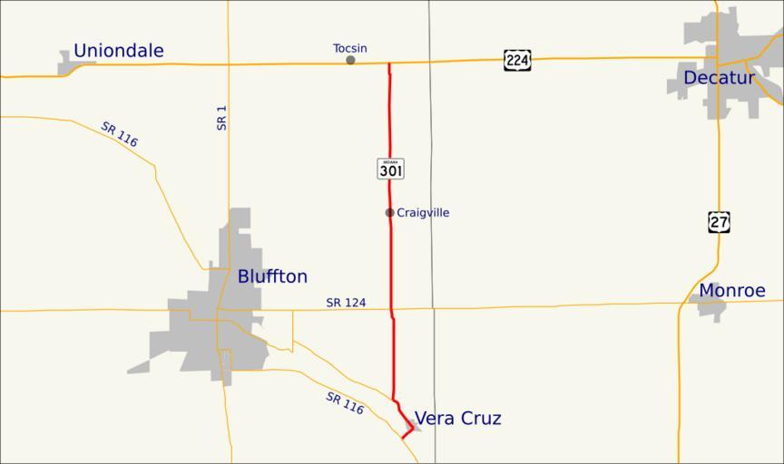 | Keywords: Map of Indiana State Road 301.svg This is a map which shows the route of Indiana State Road 301 in the United States My own work using freely-available shape data and custom-written MapScript applications 2008-03-16 Omnedon Road maps of Indiana SR301 |
