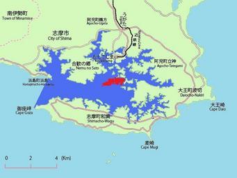 | Keywords: Map of Masaki island.jpg en This is the map of Masaki island in Shima Mie Japan Red is Masaki island Bule is Ago Bay Aqua is Philippine Sea Pink is Japan Route Yellow is Mie prefectural road ja 日 国三重 志摩市の間崎島の 図 赤が賢島 が英虞湾 水色が太平洋 桃色が国道 黄色が三重 道である own Miyuki Meinaka 2010-11-03 This map is based on File Ago Bay Map jpg Maps of Shima Mie |