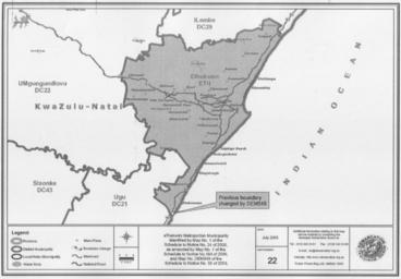 | Keywords: Map No. 22 of Schedule 2 to Notice 1998 of 2005.png Notice 1998 of 2005 Depicts the boundaries of the eThekwini Metropolitan Municipality File Notice 1998 of 2005 djvu Municipal Demarcation Board of South Africa 2005-10-31 PD-South-Africa-exempt Maps of KwaZulu-Natal municipalities with 2006 borders Notice 1998 of 2005 |
