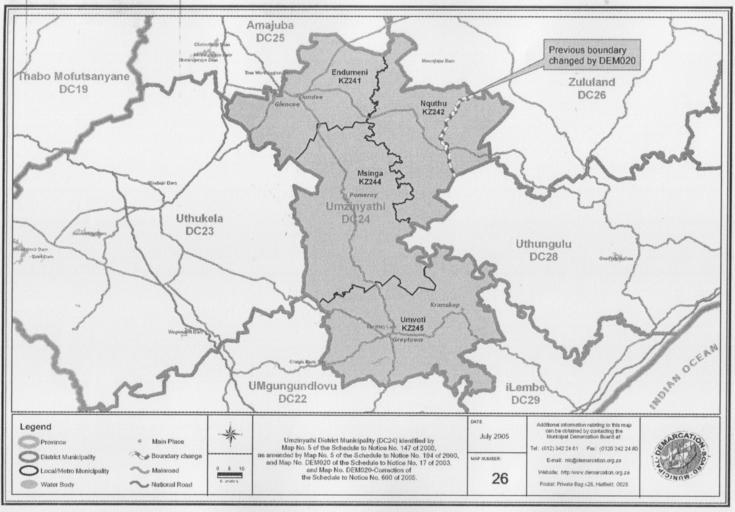 | Keywords: Map No. 26 of Schedule 2 to Notice 1998 of 2005.png Notice 1998 of 2005 Depicts the boundaries of the Umzinyathi District Municipality File Notice 1998 of 2005 djvu Municipal Demarcation Board of South Africa 2005-10-31 PD-South-Africa-exempt Maps of KwaZulu-Natal municipalities with 2006 borders Notice 1998 of 2005 |