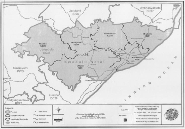 | Keywords: Map No. 30 of Schedule 2 to Notice 1998 of 2005.png Notice 1998 of 2005 Depicts the boundaries of the uThungulu District Municipality File Notice 1998 of 2005 djvu Municipal Demarcation Board of South Africa 2005-10-31 PD-South-Africa-exempt Maps of KwaZulu-Natal municipalities with 2006 borders Notice 1998 of 2005 |