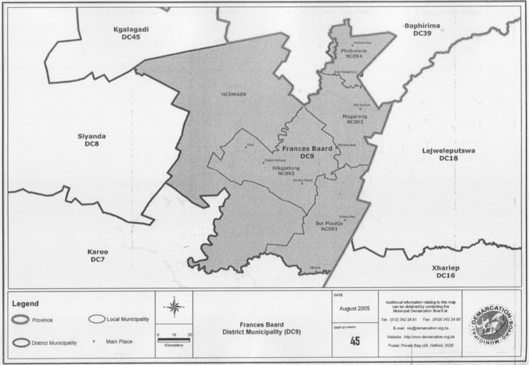 | Keywords: Map No. 45 of Schedule 2 to Notice 1998 of 2005.png Notice 1998 of 2005 Depicts the boundaries of the Frances Baard District Municipality File Notice 1998 of 2005 djvu Municipal Demarcation Board of South Africa 2005-10-31 PD-South-Africa-exempt Maps of Northern Cape municipalities with 2006 borders Notice 1998 of 2005 |