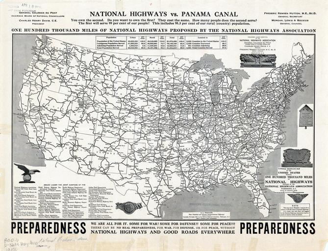 | Keywords: Map of Proposed National Highways of the United States, 1915 WDL11558.png Artwork ru алфо д Джон С fr Mulford John C en Mulford John C zh 马尔福德,约翰 C pt Mulford John C ar مَلْفورد، جون سي es Mulford John C ru Ка та национальных автомагист алей кото ые п едлагалось пост оить в США 1915 г fr Carte des routes nationales américaines proposées 1915 en Map of Proposed National Highways of the United States 1915 zh 美国拟建国家公路 图,1915 年 pt Mapa das rodovias nacionais propostas dos Estados Unidos 1915 ar خريطة لطرق الولايات المتحدة الوطنية السريعة المُقترحة، 1915 ru В 1911 г в США была основана ациональная ассоциация автомагист алей п изванная оказывать содействие азвитию национальной сети качественных автомобильных до ог Выдвинув лозунг Хо ошие до оги всем ациональная ассоциация автомагист алей выступила за создание четы еху овневой системы автодо ог п отяженностью 150 000 миль 241 402 км состоящей из автомагист алей и до ог кото ые войдут в сфе у компетенции феде ального п авительства штатов ок угов и го одов либо айонов в составе ок угов а этой ка те выпущенной ассоциацией в 1915 г показаны о иенти овочные ма ш уты важнейших автомагист алей сети общей п отяженностью 100 000 миль 160 934 км Таблица в ве хней части ка ты соде жит оценочные данные о численности и п оцентном соотношении населения п оживающего в ок угах по те ито ии кото ых должны п ойти национальные автомагист али или в смежных ок угах Создатели ка ты связывали необходимость ст оительства хо оших до ог с обсуждавшимся в то в емя воп осом о готовности США к возможному вступлению в аз азившуюся Пе вую ми овую войну К оме того они п отивопоставляли п едполагаемые выгоды от эксплуатации Панамского канала отк ытого для судоходства годом анее с п еимуществами п едложенной системы национальных до ог заявляя непонятно на каком основании что по стоимости они авны Помимо выпуска б ошю и екламных п оспектов убеждавших г аждан в необходимости создания национальной системы до ог ассоциация издавала большое количество ка т Ка тог афические аботы выполнялись коллективом п име но из 40 человек в бю о в Саут-Я муте штат ассачусетс п инадлежавшем п езиденту и соуч едителю ассоциации Ча льзу Ген и Дэвису 1865 1951 гг Дэвис полагал что эти ка ты п инесут пользу национальной комиссии по автомагист алям на создание кото ой он надеялся и помогут штатам объединить свои до оги в единую национальную систему Конг есс США так и не п инял план п едложенный ассоциацией однако деятельность этой о ганизации и выпущенные ею ка ты способствовали делу создания национальной до ожной сети <br>Плани ование автомагист алей; До оги fr La NHA Association nationale pour les grandes routes fut établie en 1911 pour promouvoir le développement d'un réseau routier national amélioré aux États-Unis Sous le slogan « De bonnes routes pour tout le monde » la NHA proposa un réseau routier de 241 402 kilomètres 150 000 miles reposant sur un quadruple système de routes au niveau national de l'État du comté de la commune ou de la municipalité Cette carte qu'elle émit en 1915 montre les tracés préliminaires des grandes routes les plus importantes de ce système parcourant au total 160 934 kilomètres 100 000 miles Le tableau dans la partie supérieure de la carte fournit une estimation des nombres et des pourcentages de personnes vivant dans les comtés traversés par ces axes routiers ou dans les comtés voisins La carte établit un parallèle entre la cause de la construction de bonnes routes et le débat qui avait lieu à l'époque sur la « préparation » à l'engagement possible des États-Unis dans la Première Guerre mondiale Elle compare également les prétendus bénéfices du canal de Panama ouvert l'année précédente à ceux du réseau routier national proposé affirmant sans étayer « Leur coût est identique » Outre la diffusion de brochures et de prospectus visant à convaincre les citoyens du besoin d'un réseau routier national la NHA produisit un grand nombre de cartes Le travail de cartographie était effectué dans un bureau de South Yarmouth dans le Massachusetts où près de 40 personnes étaient employées sur la propriété de Charles Henry Davis 1865 1951 présiden