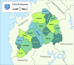 | Keywords: Map of Southern Ostrobothnia-fi.svg en Map of the municipalities of the Southern Ostrobothnia region of Finland fi Kartta Etelä-Pohjanmaan maakunnan kunnista Original version self-made in Inkscape by Mysid Municipality borders from File Suomi kunnat 2010 svg with corrections and updates Coat of arms is File Etelä-Pohjanmaan maakunnan vaakuna svg <br/> Updated in Gimp by Stryn in 2013 Oona Räisänen Mysid original version <br/> Stryn 2013 version 2010-07-17<br/> 2013-08-17 Regional location maps of Finland Municipalities in Southern Ostrobothnia |