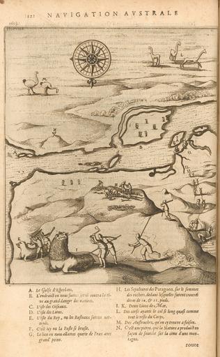 | Keywords: Map of the Strait of Magellan Developed by the Schouten and Le Maire Expedition, 1616 WDL3971.png Artwork ru Леме Якоб 1585-1616 fr Le Maire Jacob 1585-1616 en Le Maire Jacob 1585-1616 zh 勒梅尔 雅各布 1585-1616 pt Le Maire Jacob 1585-1616 ar سكوتن ويليم كورنيليسزون 1567 -1625 es Le Maire Jacobo 1585-1616 ru Ка та агелланова п олива составленная экспедицией Схаутена и Леме а в 1616 г fr Carte du détroit de Magellan créée au cours de l'expédition de Schouten et Le Maire 1616 en Map of the Strait of Magellan Developed by the Schouten and Le Maire Expedition 1616 zh 由1616年斯 顿和勒梅尔探险制 出的麦哲伦海峡 图 pt Mapa do Estreito de Magalhães Elaborado pela Expedição de Schouten e Le Maire em 1616 ar خريطة مضيق ماجلان التي وضعت من خلال الرحلة الاستكشافية للمستكشفين سكوتن ولي مير، عام 1616 ru В июне 1615 г голландские мо еплаватели Якоб Леме п име но 1585-1616 гг и Виллем Ко нелис Схаутен п име но 1567-1625 гг на двух судах <em> Энд ахт </em> и <em> Хо н </em> вышли из голландского по та Тексел в поиске нового ма ш ута в Ост-Индию В начале декаб я они высадились на побе ежье Южной Аме ики в местечке По т Дези е сов еменный г Пуэ то Десеадо А гентина а этой г авю е п име но той эпохи изоб ажены мо яки с судов <em> Хо н и Энд ахт </em> аботающие на бе егу Ст емясь пополнить запасы еды после почти шестимесячного плавания мо яки обна ужили множество видов мо ских обитателей гнезда с яйцами пингвинов и чаек а также к упных животных на кото ых они стали охотиться а пе еднем плане изоб ажены мо яки убивающие мо ских львов с помощью ост ог топо ов и ножей Вдалеке можно ассмот еть д угих людей исследующих место захо онения Компасная оза в цент е показывает что юг находится вве ху ка ты В ве хней части ка ты изоб ажены пингвины ламы и <em>нанду</em> аме иканские ст аусы Леме и Схаутен покинули А гентину в конце янва я 1616 г и стали пе выми ев опейцами обогнувшими мыс Го н Эта ка та взята из книги испанского исто ика Антонио де Э е а 1559-1625 гг <em>Historia general de los hechos de los Castellanos en las islas y tierra firma del Mar Oceano</em> Всеобщая исто ия деяний кастильцев на ост овах и мате ике Океанского мо я во ф анцузском пе еводе опубликованном в Амсте даме в 1622 г <br>Животные; Отк ытия и исследования; Охота; агелланов п олив Чили и А гентина ; о яки fr En juin 1615 les navigateurs néerlandais Jacob Le Maire env 1585 1616 et Willem Corneliszoon Schouten env 1567 1625 prirent le large à bord de deux navires le <em>Eendracht</em> et le <em>Hoorn</em> depuis le port néerlandais de Texel dans le but de trouver une nouvelle route vers les Indes orientales Ils arrivèrent en vue des côtes d'Amérique du Sud au début du mois de décembre à Port Desire aujourd'hui Puerto Deseado en Argentine Ce tirage presque contemporain montre les marins de l'<em>Eendracht</em> et du <em>Hoorn</em> en train de travailler sur la berge Cherchant à se réapprovisionner après six mois en mer les marins découvrirent une profusion de vie marine des nids de manchots et de goélands remplis d'œufs ainsi que des grands animaux qu'ils chassaient pour leur viande l'arrière-plan on aperçoit les marins en train de tuer des lions de mer à l'aide de lances de haches et de couteaux Au loin on peut voir d'autres hommes examinant un site funéraire La rose des vents au centre indique que la carte est orientée sud vers le haut Des pingouins des lamas et des <em>ñandues</em> des autruches américaines sont représentés dans la partie supérieure Après avoir quitté l'Argentine à la fin du mois de janvier 1616 Le Maire et Schouten devinrent les premiers européens à contourner le cap Horn La carte provient d'une traduction française publiée à Amsterdam en 1622 de <em>Historia general de los hechos de los Castellanos en las islas y tierra firma del Mar Oceano</em> Histoire générale des faits des Castillans dans les îles et la terre ferme de la mer océane par l'historien espagnol Antonio de Herrera 1559 1625 <br>Animaux; Découverte et exploration; Chasse; Magellan détroit de Chili et Argentine ; Marins en In June 1615 Dutch navigators Jacob Le Maire circa 1585 1616 and Willem Corneliszoon Schouten circa 1567 1625 set out in two ships the <em>Eendracht</em> and the <em>Hoorn</em> from the Dutch port of Texel seeking to find a new route to the East Indies They made landfall on the coast of South America in early December at Port Desire present-day Puerto Deseado Argentina This near-contemporary print shows the sailors from the <em>Hoorn</em> and the <em>Eendracht</em> at work on shore Seeking to replenish their supplies after nearly six months at sea the sailors found an abundance of marine life nests of penguins and gulls filled with eggs and large animals that they hunted for meat In the foregrou