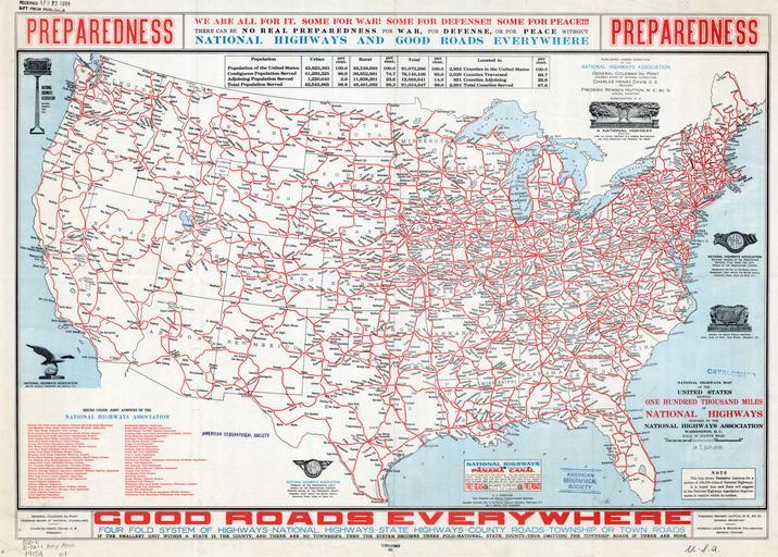 | Keywords: Map of United States Proposed National Highways, 1915 WDL11554.png Artwork ru алфо д Джон С fr Mulford John C en Mulford John C zh 马尔福德,约翰 C pt Mulford John C ar مَلْفورد، جون سي es Mulford John C ru Ка та национальных автомагист алей кото ые п едлагалось пост оить в США 1915 г fr Carte des États-Unis montrant les routes nationales proposées 1915 en Map of United States Proposed National Highways 1915 zh 美国拟建公路 图,1915 年 pt Mapa das rodovias nacionais propostas dos Estados Unidos 1915 ar خريطة للطرق السريعة الوطنية المُقترحة للولايات المُتحدة الأمريكية، 1915 ru В 1911 г в США была основана ациональная ассоциация автомагист алей п изванная оказывать содействие азвитию национальной сети качественных автомобильных до ог Выдвинув лозунг Хо ошие до оги всем ациональная ассоциация автомагист алей выступила за создание четы еху овневой системы автодо ог п отяженностью 150 000 миль 241 402 км состоящей из автомагист алей и до ог кото ые войдут в сфе у компетенции феде ального п авительства штатов ок угов и го одов либо айонов в составе ок угов а этой ка те выпущенной ассоциацией в 1915 г показаны о иенти овочные ма ш уты важнейших автомагист алей сети общей п отяженностью 100 000 миль 160 934 км Таблица в ве хней части ка ты соде жит оценочные данные о численности и п оцентном соотношении населения п оживающего в ок угах по те ито ии кото ых должны п ойти национальные автомагист али или в смежных ок угах Создатели ка ты связывали необходимость ст оительства хо оших до ог с обсуждавшимся в то в емя воп осом о готовности США к возможному вступлению в Пе вую ми овую войну в качестве союзника Великоб итании и Ф анции Помимо выпуска б ошю и екламных п оспектов убеждавших г аждан в необходимости создания национальной системы до ог ассоциация издавала большое количество ка т Ка тог афические аботы выполнялись коллективом п име но из 40 человек в бю о в Саут-Я муте штат ассачусетс п инадлежавшем п езиденту и соуч едителю ассоциации Ча льзу Ген и Дэвису 1865 1951 гг Дэвис полагал что эти ка ты п инесут пользу национальной комиссии по автомагист алям на создание кото ой он надеялся и помогут штатам объединить свои до оги в единую национальную систему Конг есс США так и не п инял план п едложенный ассоциацией однако деятельность этой о ганизации и выпущенные ею ка ты способствовали делу создания национальной до ожной сети <br>Плани ование автомагист алей; До оги fr La NHA Association nationale pour les grandes routes fut établie en 1911 pour promouvoir le développement d'un réseau routier national amélioré aux États-Unis Sous le slogan « De bonnes routes pour tout le monde » la NHA proposa un réseau routier de 241 402 kilomètres 150 000 miles reposant sur un quadruple système de routes au niveau national de l'État du comté de la commune ou de la municipalité Cette carte qu'elle émit en 1915 montre les tracés préliminaires des grandes routes les plus importantes de ce système parcourant au total 160 934 kilomètres 100 000 miles Le tableau dans la partie supérieure de la carte fournit une estimation des nombres et des pourcentages de personnes vivant dans les comtés traversés par ces axes routiers ou dans les comtés voisins La carte établit un parallèle entre la cause de la construction de bonnes routes et le débat qui avait lieu à l'époque sur la « préparation » à l'engagement possible des États-Unis dans la Première Guerre mondiale aux côtés de la Grande-Bretagne et de la France Outre la diffusion de brochures et de prospectus visant à convaincre les citoyens du besoin d'un réseau routier national la NHA produisit un grand nombre de cartes Le travail de cartographie était effectué dans un bureau de South Yarmouth dans le Massachusetts où près de 40 personnes étaient employées sur la propriété de Charles Henry Davis 1865 1951 président et cofondateur de la NHA Davis pensait non seulement que ces cartes seraient utiles à la commission des grandes routes nationales dont il espérait la création mais qu'elles aideraient également les États à intégrer leurs routes dans un système national Bien que le Congrès n'adoptât jamais le plan proposé par la NHA cette organisation et ses cartes servirent la cause d'un réseau routier national <br>Planification des routes; Routes en The National Highways Association NHA was established in 1911 to promote the 
