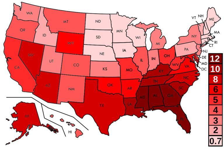 | Keywords: Map of US Murder Rate in 1945.svg en Map of US murder rate in 1945 http //www cdc gov/nchs/data/vsus/vsrates1940_60 pdf Data pgs 661 662 See File Map of US Murder Rate in 1940 svg for data 2016-04-01 own Delphi234 other versions cc-zero Maps of crime statistics for the United States |