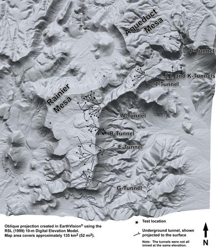 | Keywords: Maps of tunnels in Rainier and Aqueduct mesas.jpg  en Maps of tunnels in Rainier and Aqueduct mesas Rainier Mesa CAU Infiltration Model using INFILv3 LA-UR-12-22984 Daniel G Levitt and Edward M Kwicklis Earth and Environmental Sciences Division Los Alamos National Laboratory other versions PD-USGov Rainier Mesa Maps of the Nevada National Security Site |