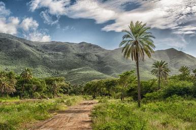 Keywords: margarita landscape scenic mountains valley road palms palm trees grass plants nature outside sky clouds country countryside