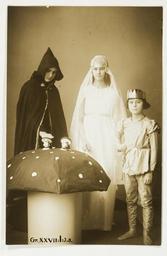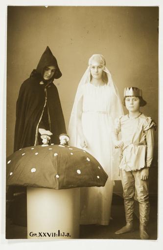 | Keywords: Margit och Erik von Geijer samt Elionore Joseph. Erik prins, Margit som fe. Elionore som häxa, 1920 - Hallwylska museet - 107989.tif LSH artwork sv FOTOGRAFIER m m FRÅN JULAFTNAR firade med familjen von Geijer 1 Från år 1913 på Wegeholm Fotografi Av Margit och Erik von Geijer som småbarn I högra nedre hörnet signerat Emil Bruno Hälsingborg Höjd 19 cm; bredd 11 cm Gåva till Wilhelmina von Hallwyl januari eller februari 1914 från hennes dotter Irma 2 Från år 1914 på Wegeholm Julgransflagga svensk Av silkespapper med stång av ståltråd Längs korsets horisontala del med svart bläck skrivet Hopp och Trohet Jul 1914 Längd 13 cm bredd 7 cm Stång längd 12 cm Gåva till Walther von Hallwyl Julaftonen 1914 från hans dotterdotter och dotterson Margit och Erik von Geijer Julgransflagga svensk och två fotografier Flagga Som den nyss beskrivna Fotografier På kort 1 Margit von Geijer som Svea stående med utslaget hår i fotsid vit dräkt med slöja pannband mörkt axelband och sandaler i högra handen Sveriges flagga med stången stödd mot marken i vänstra handen riksskölden med Lilla riksvapnet Tre kronor På kort 2 Erik von Geijer som tomte På båda i högra nedre hörnet signerat Emil Bruno Hälsingborg Kort 1 höjd 17 5 cm bredd 7 5 cm Kort 2 höjd 17 7 cm bredd 7 5 cm Gåva till Wilhelmina von Hallwyl Julaftonen 1914 från hennes dotterdotter och dotterson Margit och Erik von Geijer För beskrivning av julfirandet på Wegeholm se detta inv nummer i katalogverket Flaggorna inköpta av Irma von Geijer hos en handlare i Hälsingborg Fotografierna tagna Januari 1915 hos fotografen Emil Bruno Helsingborg 3 Från år 1915 på Wegeholm Solros Helianthus Av silkespapper och sammet med stjälk av ståltråd Blomkorg av gult kräpperat papper samt brun sammet stjälken lindad med grönt papper med foderblad och tre stjälkblad av dylikt papper Stjälk längd 31 cm Blomma diameter 14 cm Gåva till Walther von Hallwyl Julaftonen 1915 från hans dotterdotter och dotterson Margit och Erik von Geijer Solros Helianthus och två fotografier Solros Som den nyss beskrivna Fotografier På kort 1 Margit och Erik von Geijer stående hand i hand; båda klädda till änglar I högra nedre hörnet signerat Emil Bruno Hälsingborg Höjd 11 8 cm bredd 16 7 cm På kort 2 Samma barn stående i de s k arkaderna framför en dörr på Wegeholms borg samt hållande i dragstången till en blomstersmyckad liten vagn; båda klädda som på kort 1 Gåva till Wilhelmina von Hallwyl f Kempe julaftonen 1915 från Margit och Erik Geijer För detaljer om julfirandet se detta inv nr i katalogverket Fotografierna tagna Februari 1916 av fotografen Emil Bruno Helsingborg 4 Från år 1916 på Wegeholm Docka Lockigt ljusgult hår blåa ögon och röda läppar; clownkostym med bred krage och toppig mössa; på kostymen stora blåa rosetter av silkespapper Längd utan mössa 16 5 cm Mössa höjd 3 8 cm Gåva till Walther von Hallwyl julaftonen 1916 från Margit och Erik von Geijer Docka och fotografi Docka Som den nyss beskrivna Fotografi Margit och Erik von Geijer som Pierrette och Pierrot I högra nedre hörnet signerat Emil Bruno Hälsingborg Höjd 17 9 cm Bredd 12 4 cm Gåva till Wilhelmina von Hallwyl f Kempe Julaftonen 1916 från Margit och Erik von Geijer För detaljer om julfirandet se detta inv nr i katalogverket 5 Från år 1917 i Hamngatan 4 Stockholm Stjärna med spira Stjärna av guldpapper spira av trä Längd 34 5 cm Stjärna diameter 12 cm Spira längd 25 cm Gåva till Walther von Hallwyl Julaftonen 1917 från Margit och Erik von Geijer För detaljer om julfirandet se detta inventarienummer i katalogverket Fotografien tagen Februari 1918 av fotografen Herm Hamnqvist Atelier Bruno Södra Storgatan 3 Helsingborg 6 Från år 1918 i Hamngatan 4 Stockholm Penséer två stycken Av vitt s k engelskt skinn bomullssatin med stjälk av ståltråd Pressade samt handmålade i färger den ena med vit och den andra med gul mitt; stjälkarna gröna lindade med tyg som blommorna vardera med ett grönt stjälkblad Längd omkring 18 cm Gåva till Walther von Hallwyl julaftonen 1918 från Margit och Erik von Geijer Penséer två stycken och fotografi Penséer Som de nyss beskrivna Fotografi Margit och Erik von Geijer stående klädda till penséer Till höger om bilderna signerat Ferd Flodin -19 Höjd 22 8 cm Bredd 14 5 cm Gåva till Wilhelmina von Hallwyl Julaftonen 1918 från Margit och Erik von Geijer Penséerna inköpta av Irma von Geijer hos en handlare i Helsingborg Fotografien tagen 28 December 1918 av fotografen Ferd Flodin Hamngatan 3 A Stockholm 7 Från år 1919 i Hamngatan 4 Stockholm Snöboll Av vit bomullsvadd Oregelbundet klotrund utanpå beströdd med frostliknande silverglitter samt utan snöre Genomskärning omkring 4 cm Gåva till Walther von Hallwyl Julaftonen 1919 från Margit och Erik von Geijer Snöboll och fotografi Snöboll Som den nyss beskrivna Fotografi Margit och Erik von Geijer stående vända halvt åt vänster Den förstnämnda till höger båda i stor rund mössa och lång kappa av vadd med glitter samt vita strumpor; framför figurerna två stora snöbollar I högra nedre hörnet signerat Brink Foto Höjd 16 6 cm Bredd 11 2 cm Gåva till Wilhelmina von Hallwyl f Kempe julaftonen 1919 från Margit Johanna och Erik von Geijer För detaljer om julfirandet se detta inv nr i katalogverket Snöbollarna inköpta av Irma von Geijer i Buttericks Mönsteraffär Stockholm Fotografien tagen Januari 1920 av fotografen Gustaf Brink Ängelholm 8 Från år 1920 i Hamngatan 4 Stockholm Skogstomte I form av en brandgul flugsvamp Av tyg bommullsvadd och trä m m Höjd 10 8 cm Hatt diameter 9 1 cm Fotplatta diameter 5 9 cm Gåva till Walther von Hallwyl Julaftonen 1920 från Margit och Erik von Geijer Skogstomte och fotografi Skogstomte Som den nyss beskrivna men röd med vita plättar på svamphatten på kortet vid högra änden målat ett paket under en drypande lacktång Fotografi Margit och 