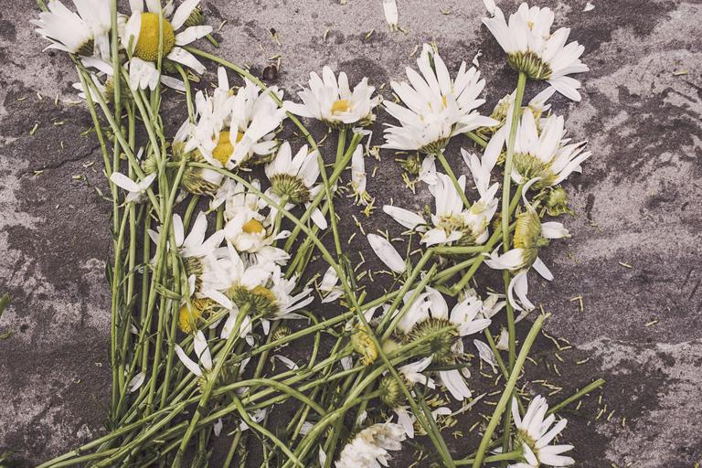 Keywords: marguerites flowers withered floor dead destroyed decay blossom sad grey urban unhappy trampled down daisies daisy