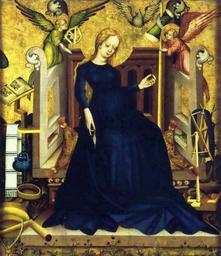 | Keywords: Maria gravida, or Mary at the Spinning Wheel from Németújvár (c.1410, Hungarian gallery).jpg Maria gravida or Mary at the Spinning Wheel from Németújvár C 1410 Tempera Wood 89 × 78 cm Inv 52 656 Location Hungarian National gallery Painted around 1410 this panel of the Madonna originally from Németújvár today Güssing Austria is one of the most valued treasures in the collection The altar painting had a horizontal format before the left side was lopped off This part of the painting had shown an angel appearing before the slumbering St Joseph in order to dispel his doubts The bit of green wing and red clothes the straw hat tied to a stick and the small cask of water in the left of the painting all clearly refer to this episode In the center of the image we see the Virgin in the company of two angels as she spins her right hand holds a spindle while her left hand guides the yarn Next to her is the spinning wheel The Holy Spirit in the form of a dove hovers by her gold halo The archangel Gabriel's words of welcome spoken at the time of the Annunciation can be read in Gothic minuscule in the book on the bookstand Ave gratia plena Dominus tecum or Hail full of grace the Lord is with you The folds of Mary's long blue dress and the handling of the light make it clear that Mary is expecting Infrared photos of the painting show that under Mary's clothes the master had sketched the child in her belly Curled up in the fetal position the tiny Jesus was surrounded by two halos with a cross on his shoulder referring to the Passion http //www mng hu/en/collections/allando/180/oldal 2/947 1410 anonymous Maria gravida spinning Files uploaded by Shakko from various sources Gothic paintings of Virgin Mary 1410s paintings Religious paintings in the Hungarian National Gallery Paintings of Virgin Mary in Hungary Güssing PD-old |