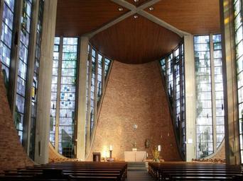 Keywords: maria koenigin saarbruecken interior church religious building altar modern bright stained glass