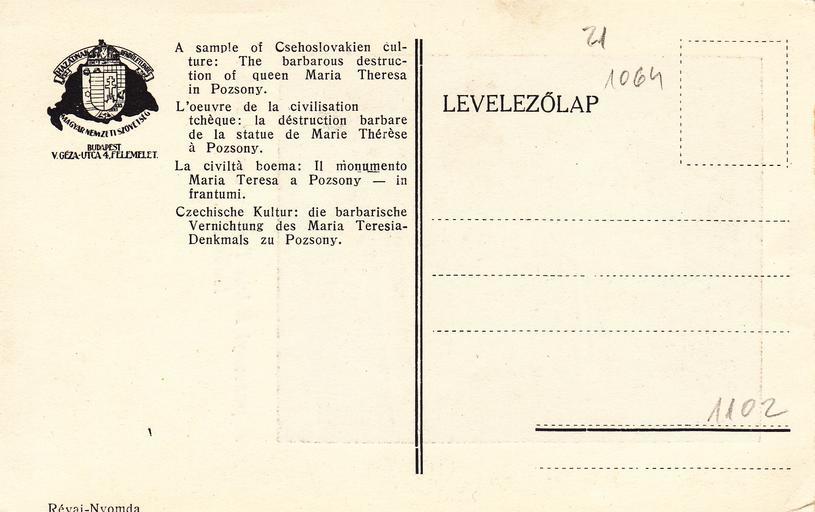 | Keywords: Maria Terezia szobor ledontes(hatlap).jpg Röplap a pozsonyi Mária Terézia-szobor szétveréséről Fordítás a kép előlapján Flyer depicting the destruction of the Maria Theresa statue in Bratislava Leták o zničení bratislavskej sochy Márie Terézie Preklad textu Česká kultúra - Barbarské zvalenie bratislavskej sochy Márie Terézie 2011 03 23 upload date CoolKoon A kép Simon László gyűjteményéből származik Picture originates from László Simon's collection Obrázok pochádza zo zbierky Lászlóa Simona Ez a mű közkincs mert szerzői joga lejárt This image is in the public domain due to its age <gallery> Image Maria Terezia szobor ledontes jpg Obverse Image Maria Terezia szobor ledontes kep png Cropped and restored picture </gallery> PD-old-70-1923 History of Bratislava History of Hungary History of Austria History of Slovakia Czechoslovak Republic 1918 1938 Postcards of Hungary Statue of Maria Theresa in Bratislava |