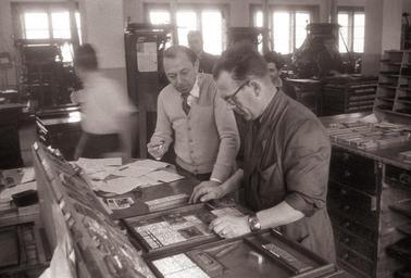 View Original:Mariborska_tiskarna_-_Tehnični_urednik_Božo_Podkrajšek_in_montažer_g._Kavčič_pri_oblikovanju_časopisne_strani_1955.jpg (1386x939)