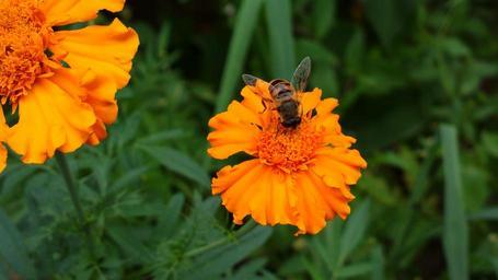 Keywords: marigold bee insect plant plants flower flowers greenery flora herbage bloom blossom floret stem beautiful colorful nature outside outdoors spring summer lovely pretty macro close-up