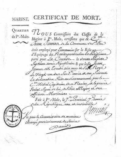 | Keywords: Marine France certificat de mort.jpg fr Attestation de la mort en mer d'un matelot corsaire le 21 pluviôse an 7 par le commissaire des classes de la marine à Saint-Malo Cote 4 S 42 Archives départementales d'Ille-et-Vilaine - Sous-série 4 S TigH 2010 Documents of the French Army Archives in France |