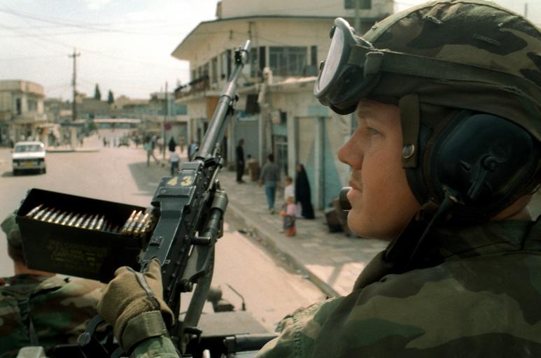 Keywords: Marine M240E1 Machine Gun.JPEG A Marine aboard an LAV-25 light armored vehicle holds onto the L7A2 machine gun mounted on the vehicle's turret while on patrol in the city Marines are in Zakhu as part of Operation Provide Comfort multinational effort to aid Kurdish refugees in southern Turkey and northern Iraq http //www defenselink mil/multimedia/ 1991-04-26 PH3 JAMES R KLEIN PD-USGov Soldiers of the United States LAV-25 People with machine guns Operation Provide Comfort L7A2 General purpose machine gun United Kingdom military M-240 machine gun |