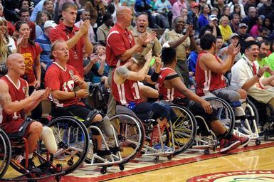| Keywords: Marines Win 2014 Warrior Games basketball 141003-D-DB155-008.jpg en Marines react as the clock counts down to a Marine Corps victory over Army during the gold medal basketball round of the 2014 Warrior Games at the Olympic Training Center in Colorado Springs Colo Oct 3 2014 Marine Corps beat Army 43-30 DoD News photo by EJ Hersom 2014-10-03 EJ Hersom https //www dvidshub net/image/1597001 141003-D-DB155-008 2014-10-04 01 33 COLORADO SPRINGS CO US PD-USGov 2014 Warrior Games Images from DoD uploaded by Fæ |