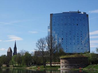 Keywords: maritime hotel ulm home mirroring facade building architecture danube reflection river water