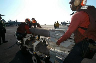| Keywords: Mark 83 Bombs.jpg Onboard the US Navy USN Aircraft Carrier USS JOHN F KENNEDY CV 67 Aviation Ordnancemen assigned to Fighter Squadron One Zero Three VF-103 position a Mark 83 1 000-pound general purpose bomb onto a skid as aircraft assigned to Carrier Air Wing Seventeen CVW-17 are prepared for missions in support of Operation IRAQI FREEDOM 041108-N-8704K-002 Navy http //www dodmedia osd mil/Assets/2005/Navy/DN-SD-05-03202 JPEG ID DNSD0503202 Service Depicted Navy<br>Operation / Series IRAQI FREEDOM<br>Camera Operator PH3 AW/SW JOSHUA KARSTEN USN 2004-11-08 PD-USN Mark 83 bomb USS John F Kennedy CV-67 flight deck United States Navy in the Iraq War Weapons of the Iraq War Aviation Ordnanceman Fighter Squadron 103 United States Navy |