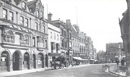 | Keywords: Market Place, Reading, looking south-eastwards to High Street, c. 1890.jpg en Market Place Reading looking south-eastwards to High Street c 1890 On the east side Nos 20 and 21 Market Place Chambers with signs for Butler and Company auctioneers valuers and surveyors and for Arthur Ayres auctioneer and estate agent ; Nos 19 and 18 Elephant Hotel ; No 17 Frank Cooksey estate agent ; Nos 16 15 14 and 13 London and County Bank ; Nos 12 and 11 Morris and Davis tailors ; Nos 10 9 and 8 Sutton and Sons Royal Seed Establishment ; No 7 Reading Mercury office On the south side No 52 Hill and Company rubber merchants A horse-bus waits outside Cooksey's The Simeon Obelisk with cabmen's shelter behind it is visible to the right and in front of them two delivery tricycles are parked by the kerb 1880-1889 postcard with caption Market Place 1887 by Berkshire County Library from a glass negative by H W Taunt Box 22 No 8574 1890 http //readingimages epixtech co uk/extra/test3 html Reading Borough Libraries Creator Henry Taunt PD-old-80 Market Place Reading Carriages in the United Kingdom Reading in the 1890s Henry Taunt 1890 in England 1890 photographs |