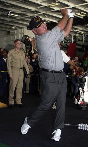 Keywords: MarkOMeara2004.jpg Sailors watch professional golfer Mark O'Meara hit a few golf balls during a demonstration in the hanger bay of the nuclear powered aircraft carrier USS George Washington O'Meara accompanied by Tiger Woods Woods' fiancée Elin Nordegren and caddies Steve Williams and Greg Rita visited the Norfolk Va Based carrier in the Arabian Gulf before participating in the European PGA Tour ™s Dubai Desert Classic the following day The George Washington Carrier Strike Group CSG and Carrier Air Wing Seven CVW-7 were deployed to the Arabian Gulf in support of Operations Iraqi and Enduring Freedom U S Navy photo 040303-N-5319A-007 http //www news navy mil/view_single asp id 12365 direct image URL http //www news navy mil/management/photodb/photos/040303-N-5319A-007 jpg 2004-03-03 Photographer's Mate 1st Class Brien Aho Public domain PD-USGov-Military-Navy Aboard USS George Washington CVN-73 Mark O'Meara |