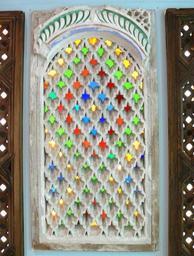 Keywords: Marokko Meknes Fenster Linden-Museum.jpg Fenster mit bunten Glassteinen Meknes Marokko 19 Jh <br />Linden-Museum Stuttgart own 2008-05 User KarlHeinrich Abteilung Islamischer Orient Linden-Museum Windows Art of Morocco