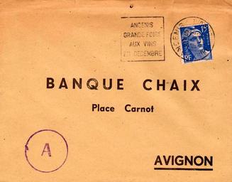 | Keywords: Marque postale Daguin Ancenis sur lettre banque Chaix Avignon.jpg fr Marque postale Daguin Ancenis sur lettre banque Chaix Avignon 2016-10-31 13 09 45 scan old cover author other versions Custom license marker 2016 11 02 PD-old Postal covers of France Postmarks of France Daguin machine Wine feasts |
