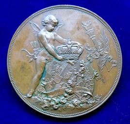 | Keywords: Marriage Medal of Ferdinand I of Romania 1893 by Scharff. Reverse.jpg en This wedding took place in Sigmaringen Württemberg Germany the place of birth of Ferdinand I Bronze medallion d 50 mm Ferdinand I Ferdinand Viktor Albert Meinrad King of Romania 1914- 1927 and Maria Alexandra Victoria Princess Marie of Edinburgh 1875 Eastwell Park Kent England - Pelișor Castle Sinaia Romania Queen Victoria of the United Kingdom of Great Britain and Ireland was her grandmother Conjoined busts l 2 lines around FERDINAND PRICIPE MOSTENITOR AL ROMANIEI MARIA PRICIPESA DE MAREA BRITANIA SI IRLANDA / Cupid crowning the royal coat of arms of Romania and Great Britain On ribbon below 29 DECEMBRE 1892 10 JANUARIE 1983 Wurzbach 2074 Eimer 1779 Medallist A Anton Scharff 1845 Wien - 1903 Brünn Austria Condition EXTREMELY FINE little tarnish 1893-01-10 own Berlin-George other versions cc-by-sa-4 0 PD-old-100 This photo PD-1923 Ferdinand I of Romania on medals Queen Marie of Romania 1893 medals Wedding medals Medals of Romania Sigmaringen |