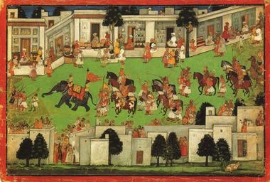| Keywords: Marriage Procession in a Bazaar.jpg Marriage Procession in a Bazaar Mandi 1645 The Imminent Arrival of the Groom Folio from a Ramayana Series By an Early Master at the Mandi Court Painting at the Hindu courts in the early seventeenth century displayed a spectrum of styles that derived in varying degrees from the Chaurapan-chasika traditional Rajput and Mughal traditions Although painting is known from only one court in the hill states Mandi Source A princely bridegroom on a horse is escorted to his wedding by riders attendants and musicians Painted by a Mughal-trained master working at the Hill court of Mandi this procession scene gives an unusually vivid view of a prosperous 17th century bazaar The shops sell brass vessels pan betel-leaf sweets glass or ceramic flasks and vases knives daggers and sword-hilts textiles and grains and pulses Held by the Ashmolean Museum University of Oxford 1645 http //warfare2 likamva in/Moghul/17thC/Moghul_17thC htm author PD-old-100 Ramayana Uploaded with VicuñaUploader Street scenes in art 1645 Processions in art |