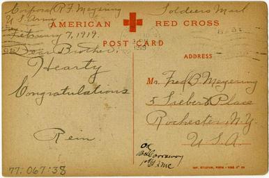 | Keywords: george_eastman_house georgeeastmanhouse armistice day armisticeday soldiers mail soldiersmail post card postcard carte postale cartepostale red cross redcross fred b. meyering fredbmeyering february 7, 1919 february71919 1919 corporal r. j. meyering corporalrjmeyering brother rein france rochester, ny rochesterny post mark postmark american red cross americanredcross u s army usarmy congratulations color:rgb_avg=bfa066 color:rgbavg=bfa066 text document indoor writing Accession Number: 1977:0067:0038v Maker: Unidentified Photographer Title: Marshal FOCH Date: ca. 1915 Medium: photomechanical reproduction Dimensions: Overall: 13.8 x 9.2 cm George Eastman House Collection General – information about the George Eastman House Photography Collection is available at www.eastmanhouse.org/inc/collections/photography.php. For information on obtaining reproductions go to: www.eastmanhouse.org/flickr/index.php?pid=1977:0144:0050MP. Accession Number: 1977:0067:0038v Maker: Unidentified Photographer Title: Marshal FOCH Date: ca. 1915 Medium: photomechanical reproduction Dimensions: Overall: 13.8 x 9.2 cm George Eastman House Collection General – information about the George Eastman House Photography Collection is available at www.eastmanhouse.org/inc/collections/photography.php. For information on obtaining reproductions go to: www.eastmanhouse.org/flickr/index.php?pid=1977:0144:0050MP. |