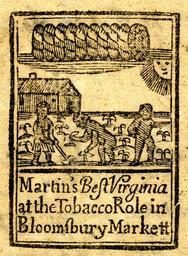 | Keywords: Martin's Best Virginia tobacco advertisement.jpg en Martin's Best Virginia at the Tobacco Role in Bloomsbury Market woodcut advertisement for Virginia tobacco and showing black children working on a tobacco plantation in Virginia 58 mm x 42 mm Courtesy of the British Museum London British Museum http //www britishmuseum org/research/search_the_collection_database/search_object_details aspx objectid 1614818 partid 1 searchText virginia fromADBC ad toADBC ad titleSubject on numpages 10 images on orig 2fresearch 2fsearch_the_collection_database aspx currentPage 2 Author century 18 18th-century colonial way of life Woodcuts Tobacco advertising Virginia in the 18th century Slavery in Virginia History of tobacco Agriculture in Virginia PD-old-100 |