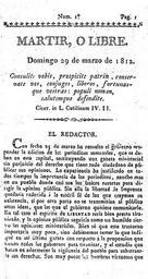 | Keywords: Martir o Libre - Primer número - 1812.jpg en Front page of Argentine patriot newspaper Martir o Libre directed by Bernardo de Monteagudo during the Independence Revolution of Argentina es Primera plana del diario patriota argentino Martir o Libre dirigido por Bernardo de Monteagudo durante la Revolución por la Independencia de Argentina Martir o Libre 1812 Bernardo de Monteagudo Buenos Aires Biblioteca Nacional Bernardo de Monteagudo 1812 PD-old-100 Scanned Spanish texts Newspapers of Buenos Aires 1812 newspapers |