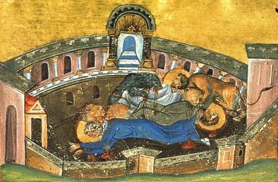 | Keywords: Martyrs Silvanus the Bishop of Emesa, Luke the deacon, and Mocius (Mucius) the reader (Menologion of Basil II).jpg Священномученик Сильван Лука диакон Эмесский Емисский и окий чтец Константинополь 985 г иниатю а инология Василия II Ватиканская библиотека Рим http //www pravoslavie ru/put/51649 htm 985 г anonymous PD-Art Menologion of Basil II Files uploaded by Shakko from various sources Damnatio ad bestias Mocius | ||||