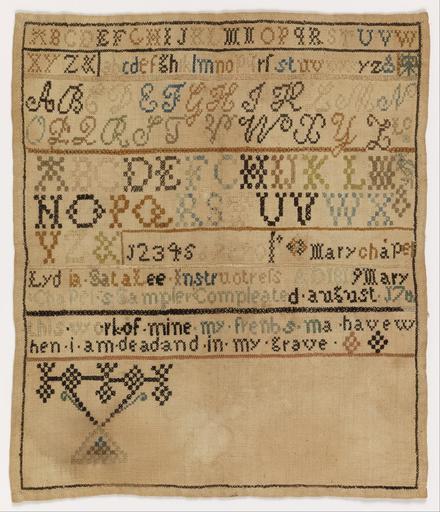Keywords: Mary Chapel - Sampler - Google Art Project.jpg Mary 6852104 Chapel /collection/cooper-hewitt-national-design-museum/artwork/sampler-mary-chapel/6852105/ 176724 Mary Chapel /artist/elizabeth-edwards/28878711/ 28878711 /collection/cooper-hewitt-national-design-museum/ Cooper-Hewitt National Design Museum 3644669 http //www cooperhewitt org/ /collection/cooper-hewitt-national-design-museum/artwork/sampler-mary-chapel/6852105/ 1819 1819 Medium silk embroidery on linen foundationTechnique embroidered in cross eyelet and herringbone stitches on plain weave foundation By 1929 Alexander W DrakeBy 1929 American Art Galleries1929 - 1981 Gertrude M Oppenheimer1981 Cooper-Hewitt Museum 325 6852105 False 1819 1981-28-141 http //collection cooperhewitt org/view/objects/asitem/id/176724 Bequest of Gertrude M Oppenheimer Sampler 1810 1820 w280 x h325 cm 1819 False 0 859375 Object sampler-mary-chapel Sampler s 280 Ethel Stanwood Bolton and Eva Johnston Coe American Samplers Boston The Massachusetts Society of the Colonial Dames of America 1921 137 H x W 32 4 x 28 cm 12 3/4 x 11 in Mary Chapel Lydia Sata Lee Instructress A D 1819 Mary Chapel's sampler compleated August 17th Medium silk embroidery on linen foundationTechnique embroidered in cross eyelet and herringbone stitches on plain weave foundation By 1929 Alexander W DrakeBy 1929 American Art Galleries1929 - 1981 Gertrude M Oppenheimer1981 Cooper-Hewitt Museum special url_id gQGuZADRbgxR6A PD-old-100-1923 Google Art Project works by Mary Chapel Textiles in the Cooper “Hewitt Smithsonian Design Museum 1810s samplers Google Art Project works in Cooper-Hewitt Smithsonian Design Museum 1819 works |