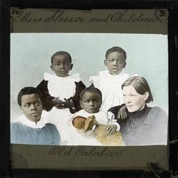 | Keywords: Mary Slessor and Four Children, Old Calabar, late 19th century (imp-cswc-GB-237-CSWC47-LS2-036).jpg en <br> Mary Slessor and Four Children Old Calabar late 19th century Mary Slessor pictured with four young girls All four children are dressed in western style clothing and the youngest child in the foreground of the picture is holding a knitted doll ; Mary Slessor was a Scottish missionary known for her work in Africa and here she adopted abandoned children most notably twin babies and the children of slaves The four children in this image Janie Alice Maggie and Mary travelled to Scotland with Mary on a return visit home as she was afraid to leave them unprotected in Calabar Photographer Unknown Subject personal name Slessor Mary Mitchell 1848-1915 Filename imp-cswc-GB-237-CSWC47-LS2-036 tif Coverage date before 1915 Part of collection International Mission Photography Archive ca 1860-ca 1960 Type images Part of subcollection Photographs from the Centre for the Study of World Christianity University of Edinburgh U K ca 1900-ca 1940s Repository name Centre for the Study of World Christianity Archival file impaunpub_Volume7/1310 url Repository address The University of Edinburgh School of Divinity New College Mound Place Edinburgh EH1 2LX United Kingdom Geographic subject country Nigeria Format aacr2 1 lantern slide 8 x 8 cm Geographic subject continent Africa Rights Contact the repository for details Part of series Mary Slessor LS2 Repository email divinity-CSWC ed ac uk Subject lcsh Keyword Adopted children; Population Date created circa 1880 Publisher of the digital version University of Southern California Libraries Subject aat genre group portraits Format aat lantern slides Legacy record ID impa-m68180 Access conditions http //www ed ac uk/schools-departments/divinity/research/centres/world-christianity/collections-resources File GB 237 CSWC47/LS2/36 1880 author http //digitallibrary usc edu/cdm/ref/collection/p15799coll123/id/64432 PD-old-70-1923 Magic lantern images Images from USC Digital Library uploaded by Fæ International Mission Photography Archive ca 1860-ca 1960 Adoption Calabar |
