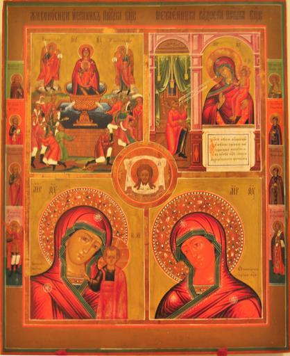 | Keywords: Maryhill Museum - Quadripartite icon of the Mother of God (late 19th century Russian icon) 01.jpg en Quadripartite icon of the Mother of God Egg tempera and gold leaf on wood panel Maryhill Museum of Art Maryhill Washington Four images of the Mother of God surrounding the Mandylion with ranks of saints at left and right Photo by Joe Mabel century 19 Unknown Russian PD-old-70 Maryhill Museum of Art 19th-century icons of Russia Multiple-images marian icons | ||||