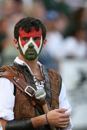 Keywords: mascot warrior high school football male character person sword barbarian guy face paint makeup ancient disguise masculine looking intense red american sexy young