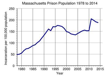 | Keywords: Massachusetts Prison Population.svg en Massachusetts prison incarceration rate per 100 000 population from 1978 to 2014 Data from http //www bjs gov/index cfm ty nps BJS 2016-05-10 own Delphi234 other versions current annually Generated with Wikimedia SVG Chart SVG Chart/box cc-zero Prisons in Massachusetts Imprisonment and detention rates in the United States |