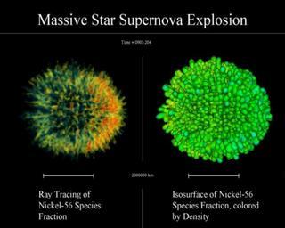 | Keywords: Massive Star Supernovae Explosions.jpg en Three Dimensional Radiation Hydrodynamics Calculations of Massive Star Supernovae Explosions The DJEHUTY stellar evolution code was used to calcuate the explosion of SN 1987A model in three dimensions including the production and distribution of radioactive Ni-56 which powers most of the light emanating after the first few days 2x10<sup>51</sup> ergs of energy were placed within the innermost 150 km of the model to initiate the explosion The initial density field was perturbed 10 to allow instabilities to grow which is mandated by observations Self-gravity was run in the spherical approximation but was centered on a self-consistently calculated center of mass The simulation encompassed the whole star contained 11 million cells and was run on 512 processors of LLNL's Frost supercomputer for 36 hours The resulting dataset was approximately 2 terabytes https //wci llnl gov/codes/visit/gallery html Visualizations that have been created with VisIt at wci llnl gov UCRL Updated November 8 2007 PD-USGov Scientific visualization Terabyte Isosurfaces Ray tracing 3D computer graphics |