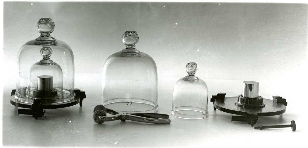 Keywords: MassStandards 005.jpg The platinum-iridium cylinder right was the primary standard kilogram for all metric measurements in the U S Known as Kilogram No 20 it was a copy of the International Prototype Kilogram which was preserved at the International Bureau of Weights and Measures at Sevres France Kilogram No 4 left under double bell jar a duplicate of No 20 was used as a secondary standard Noth cylinders were 39 mm in diameter and 39 mm high; they were made of 90 percent platinum and 10 percent iridium Re-comparison of Kilogram No 20 with the international standard in 1937 showed that the United States standard had changed by only one part in 50 million during approximately 50 years National Institute of Standards and Technology National Institute of Standards and Technology PD-USGov-NIST PD-USGov National Bureau of Standards National Institute of Standards and Technology Weights Metrology Kilogram Units of mass Units of measure |
